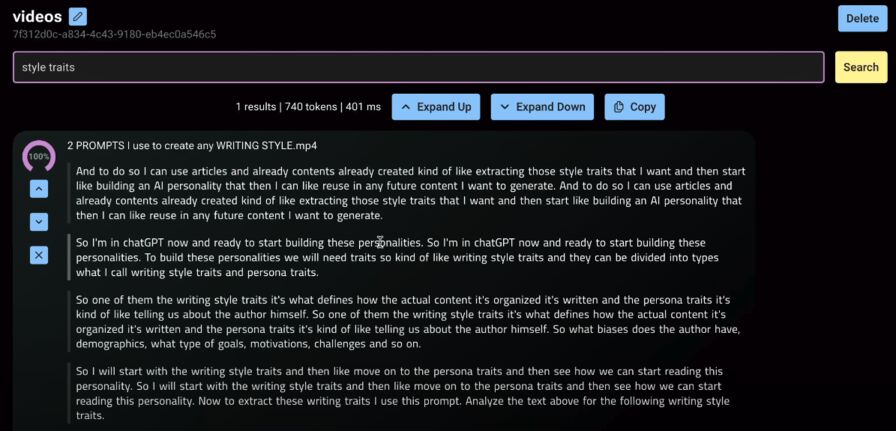 Once done, you can search the library to find transcribed text snippets. These can be used to enhance AI content creation by injecting relevant multimedia information.